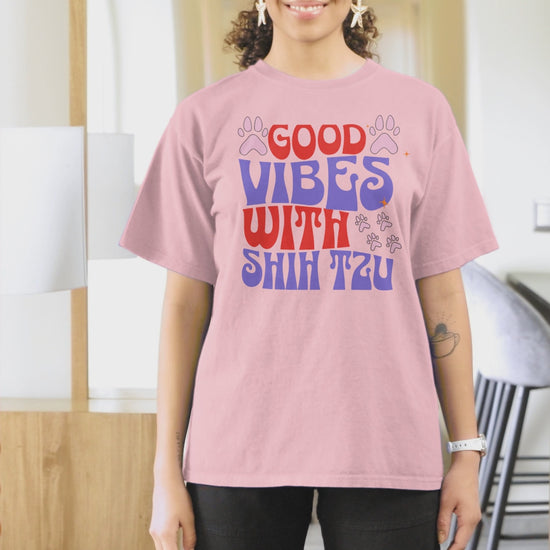 Available in multiple colors and sizes, the "Good Vibes with Shih Tzu" T-shirt is the perfect blend of fun, comfort, and personality. Whether you’re out for a casual day or relaxing at home, this tee is a great way to show off your Shih Tzu pride.